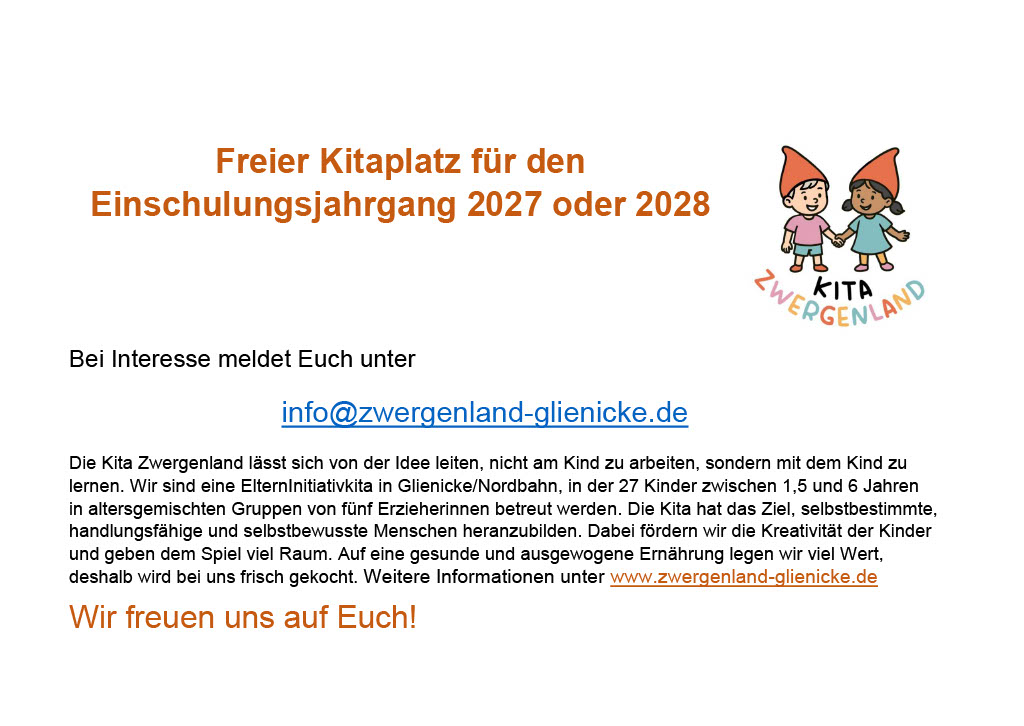 Auf den folgenden Seiten möchten wir Euch unsere Kindertagesstätte vorstellen. Es würde uns freuen, wenn wir Euch für unser Zwergenland begeistern können. Ruft gerne an unter (0 330 56) 43 84 75, schreibt eine Mail an info@zwergenland-glienicke.de oder besucht uns in unserer Kita im Sonnengarten, Kornblumenweg 8 in Glienicke/Nordbahn.